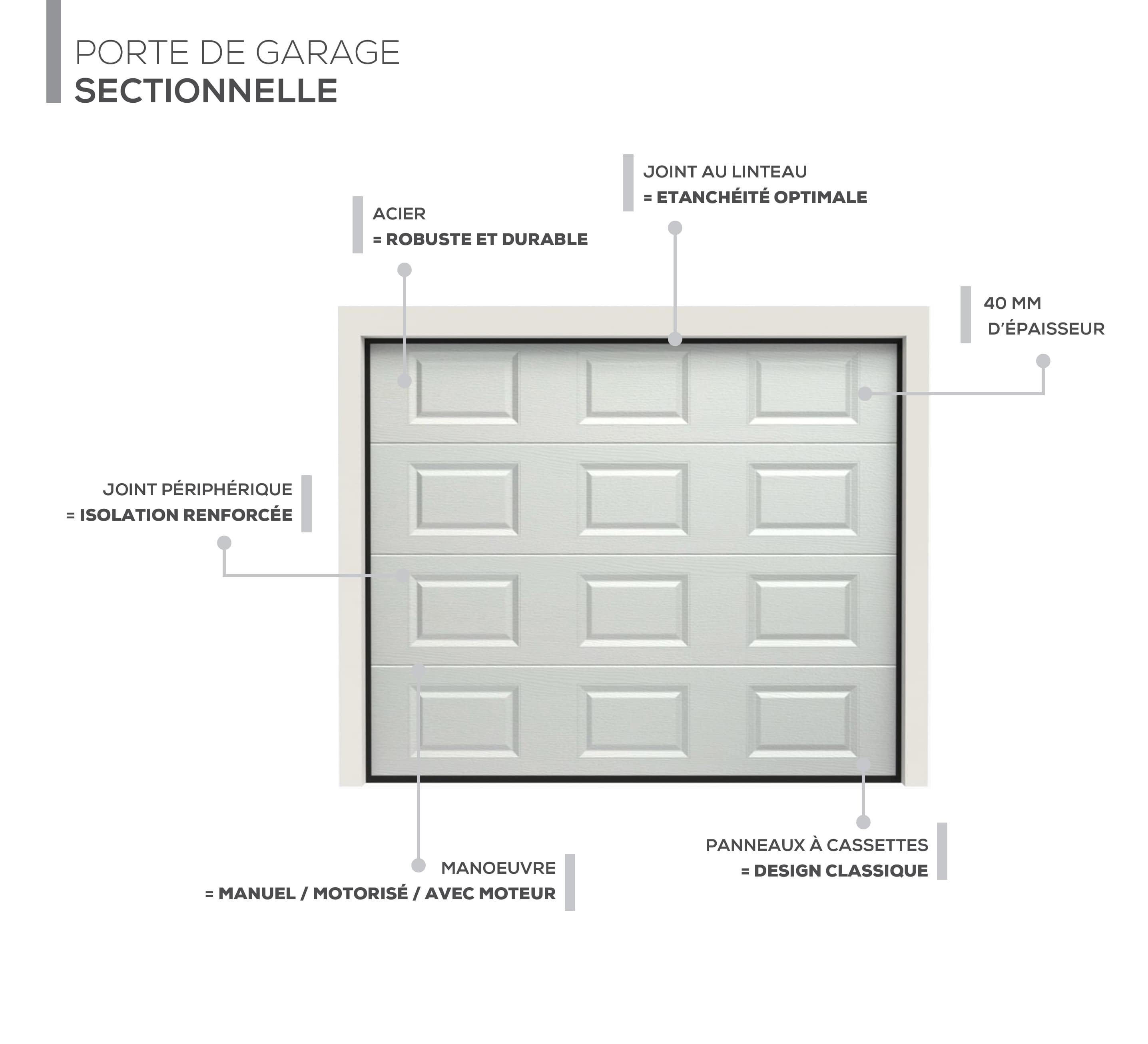 Découvrez notre porte de garage sectionnelle motorisée, un choix optimal pour ceux qui recherchent une isolation efficace et une protection renforcée. Avec sa conception moderne, elle répond à tous vos besoins.