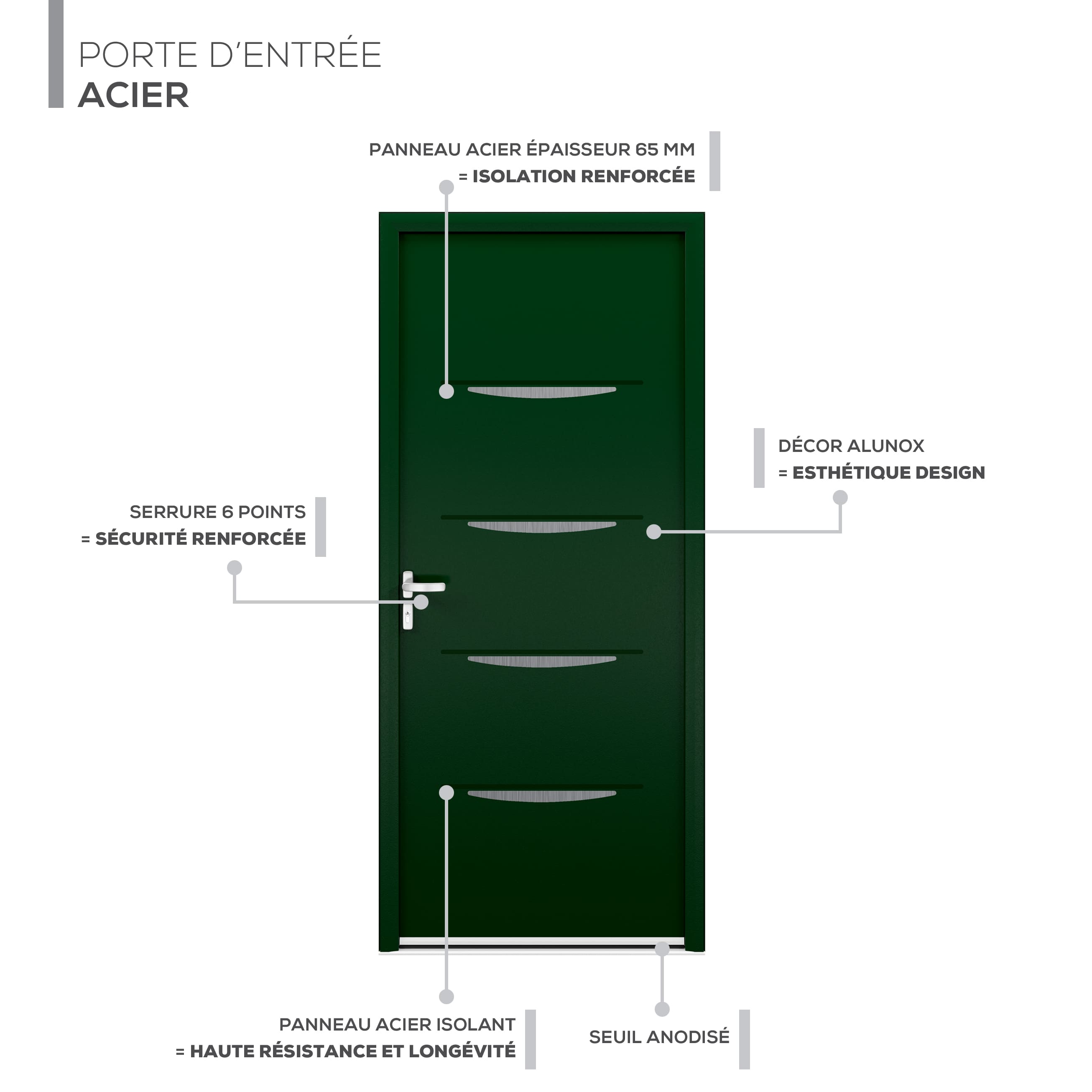 - Matériau : Acier avec une isolation de 65mm d'épaisseur pour une performance thermique accrue.